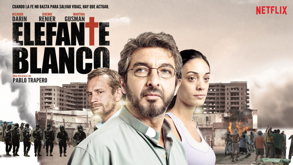 Basada en hechos reales, “Elefante blanco” muestra un edificio en proceso de construcción inconcluso o fallido de su historia y arquitectura, que finalmente fue demolido entre 2018 y 2019, con el peso de promesas políticas jamás cumplidas. En ese contexto se juegan las tensiones entre curas villeros, vecinos/as como voluntarios/as civiles, empleados de la salud versus su forma negativa representados en los narcotraficantes, mafias o pandillas, cada grupo con una cultura particular y propia. Los actores y las actrices sociales benevolentes intervienen directamente en los conflictos, más allá de reconocer algunos límites en determinados lugares del barrio que habitan (por adopción o elección) y de vivir los conflictos entre personas que intentan… Todo es INTENTAR -¡¿intentar qué…?!-. El compromiso de una persona con y hacia otra persona, una historia tensa, que moviliza y está al otro lado de tu vereda, o a unas pocas cuadras de tu casa.